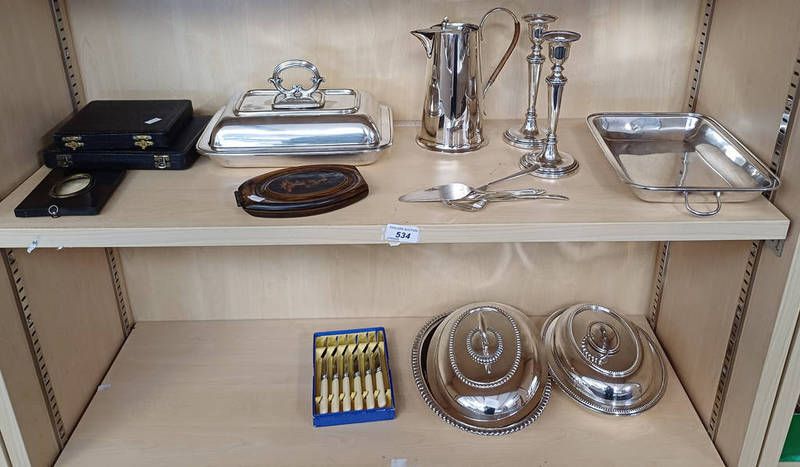 Selection of silver plated ware including 3 entree dishes, pair candlesticks, etc on 2 shelves