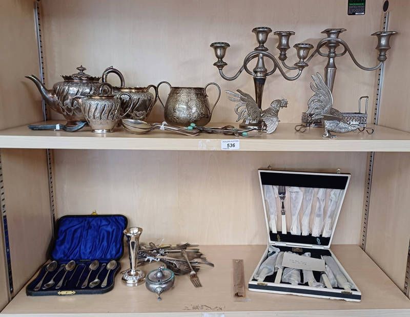 Selection of silver plated ware including 3 piece teaset, pair candelabra etc on 2 shelves