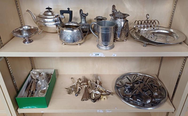 Selection of silver plated ware, etc including octagonal salver, 3 piece teaset, cutlery etc on 2 shelves