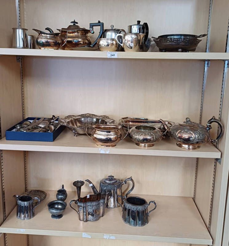 Large selection of silver plated ware including teasets, cutlery, etc on 3 shelves