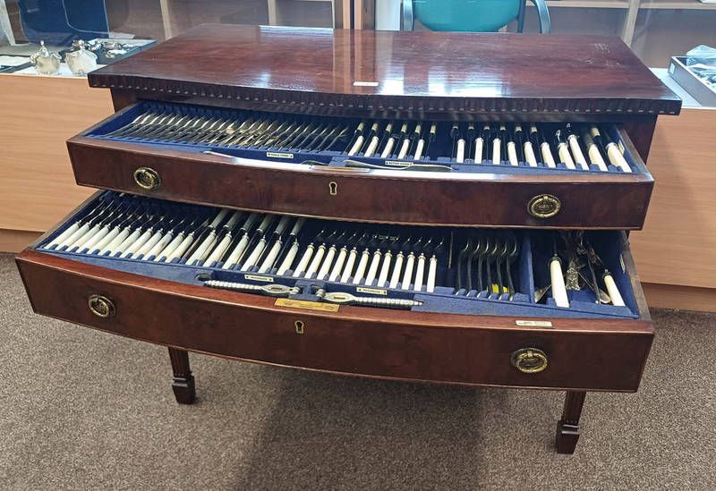 Silver plated 12 place canteen of cutlery in a fitted mahogany cabinet on square tapered supports by walker & hall
