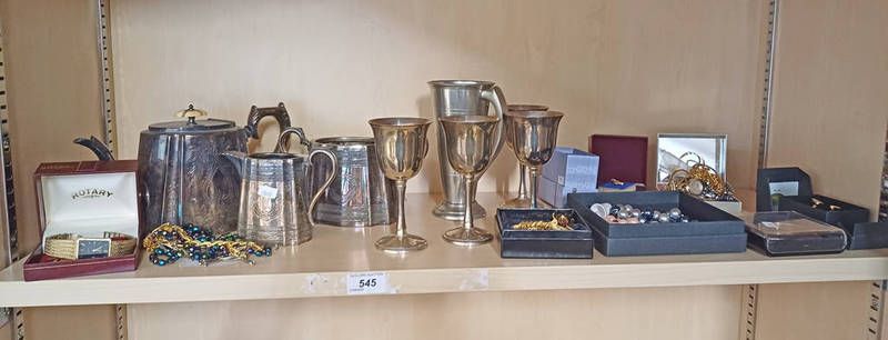 Silver plated 3 piece teaset, various costume jewellery, etc on 1 shelf