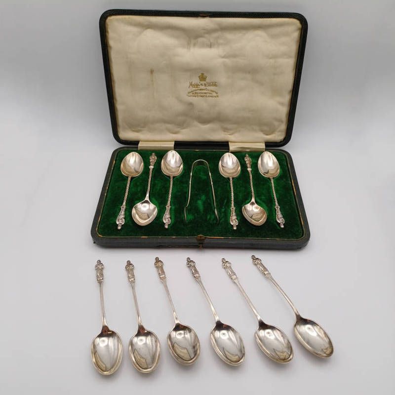 A cased set of 6 silver apostle spoons & sugar tongs by sibray, hall & co ltd, london 1912 & another set of 6 silver apostle spoons, 146g