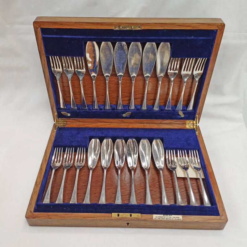 Early 20th century oak cased set silver plated fish knives & forks by sorley, glasgow