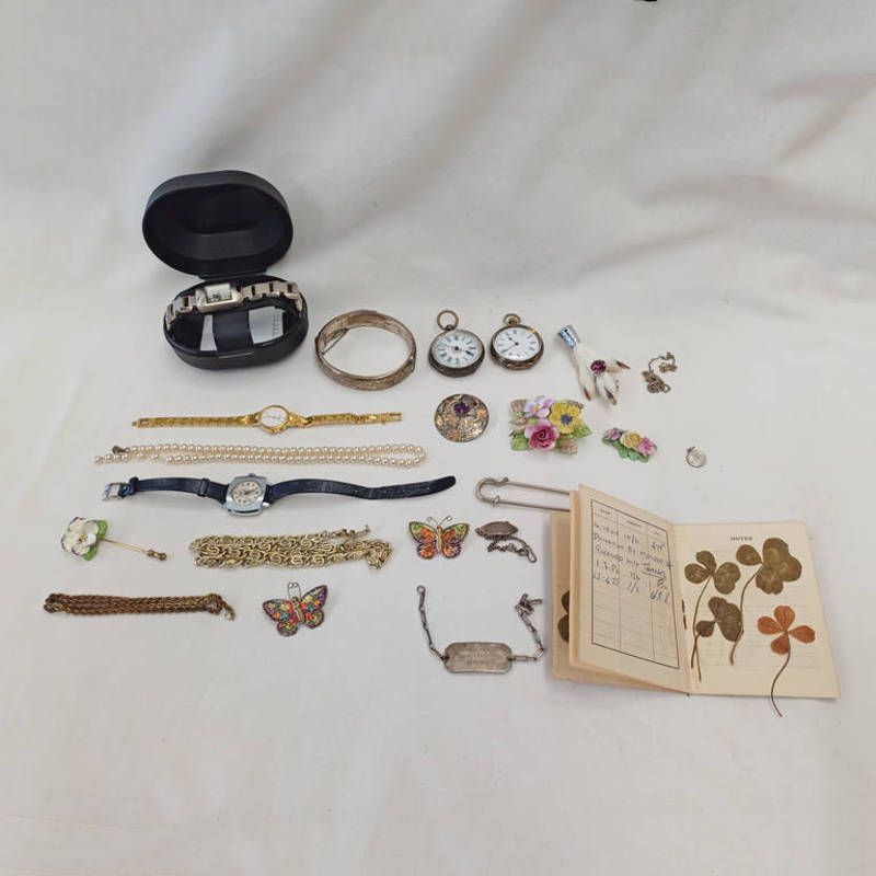 Silver openface pocket watch, 935 silver fobwatch, 3 silver watch chains, various wristwatches, etc