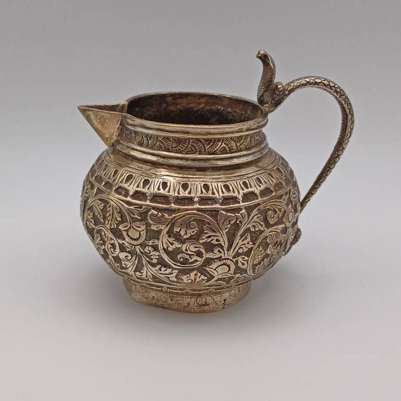 Indo-persian white metal cream jug with foliate decoration & cobra handle, 8cm tall