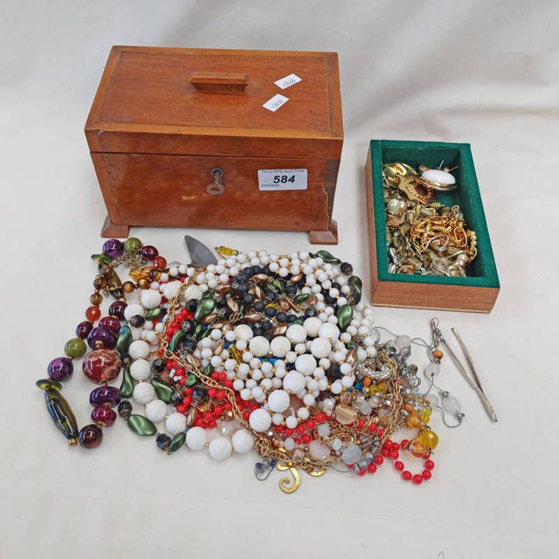 Early 20th century mahogany jewellery box & contents of bead necklaces, brooches, etc