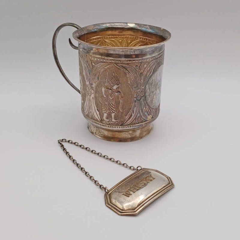 Modern silver whisky label & far eastern white metal mug decorated with figures