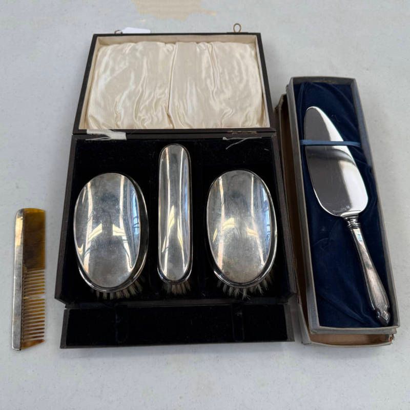 3 silver backed brushes & silver backed comb, birmingham 1928 in fitted case & silver plated serving slice