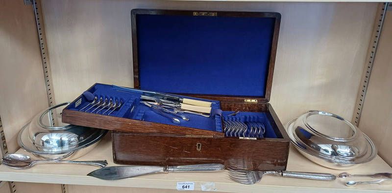 Oak cased canteen of silver plated cutlery, 2 silver plated entree dishes, etc on 1 shelf
