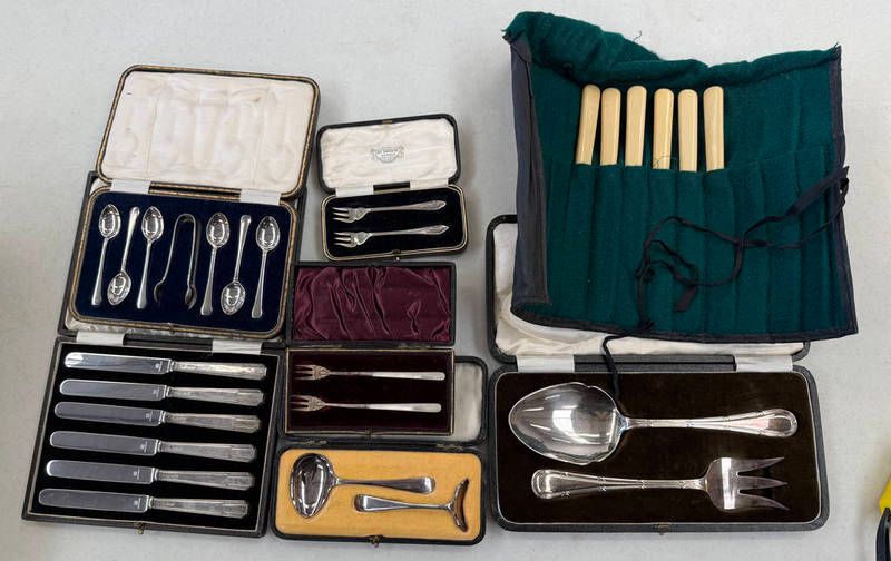 Cased pair of silver pickle forks, cased pair of silver & mother of pearl pickle forks, various cased silver plated cutlery, etc