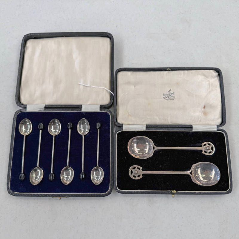 Cased pair of arts & crafts silver spoons by a e jones, birmingham 1925 & cased set of 6 silver coffee bean spoons by walker & hall, sheffield 1925 - 81g total weighable silver