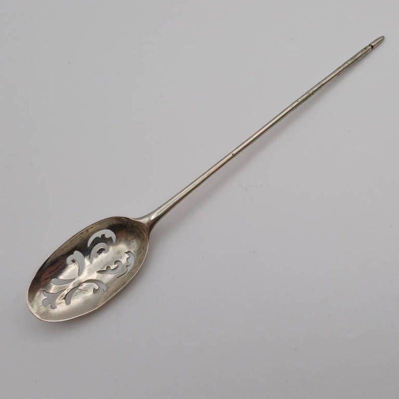 An 18th century silver mote spoon with decorative pierced bowl, marks rubbed