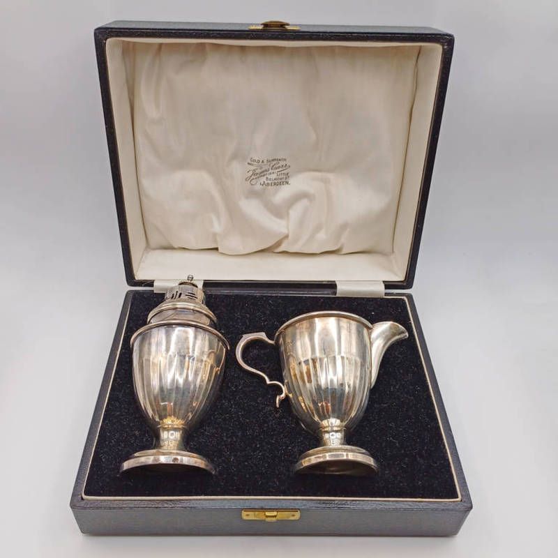 Cased silver sugar caster & cream jug set by james carr of aberdeen, hallmarked birmingham 1932 - 156g