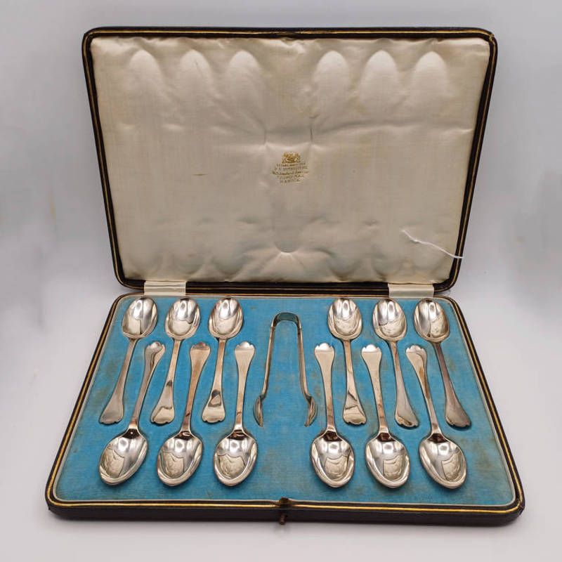 Cased set of 6 silver trefid teaspoons & sugar tongs by william batt & son, sheffield 1910. 233g