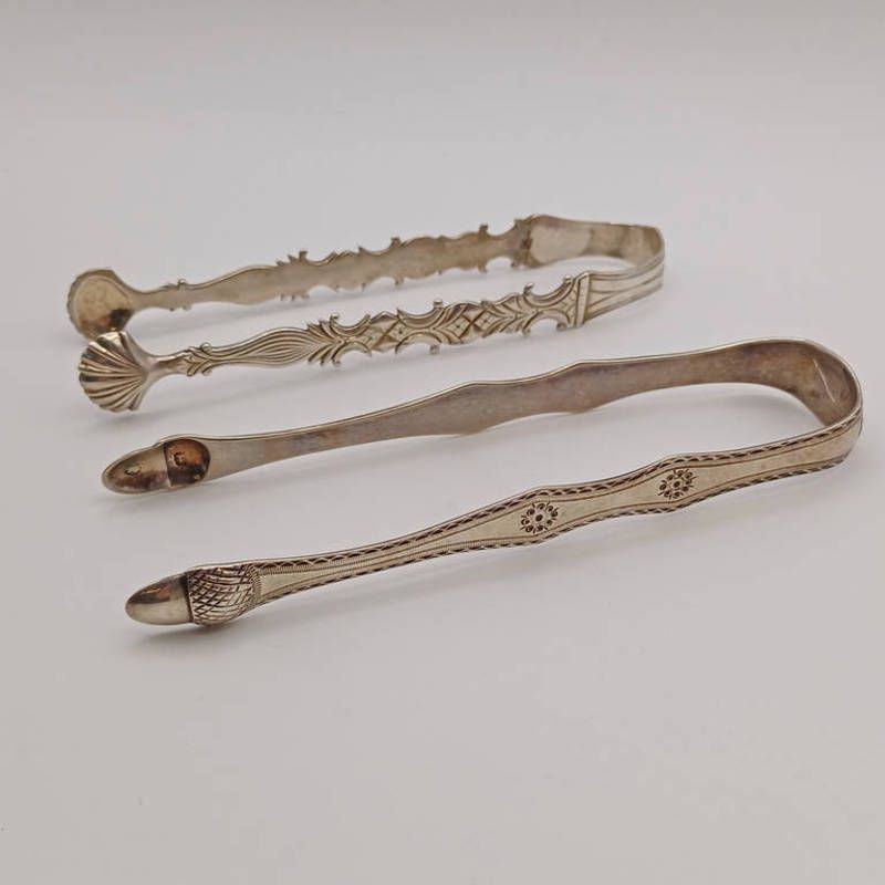 2 pairs of georgian silver sugar tongs, 1 with acorn bowls & another with shell bowls - 68 grams