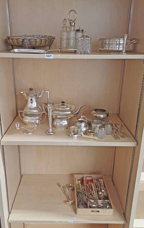 Large selection of silver plated ware including 4 piece teaset, cutlery candlestick etc over 3 shelves
