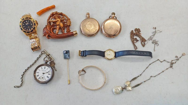 Silver openface pocketwatch, 2 gilt hunter pocketwatches, 2 wristwatches, meerschaum pipe depicting a cherub, etc