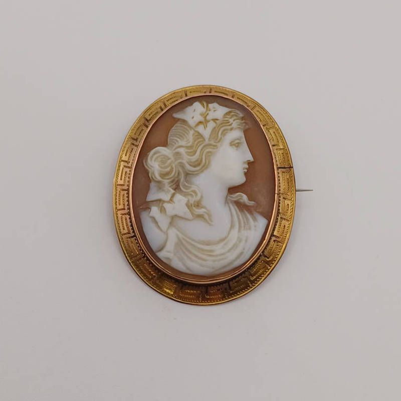 9ct gold oval cameo brooch with greek key design border, 4.5 cm long, 7.4g