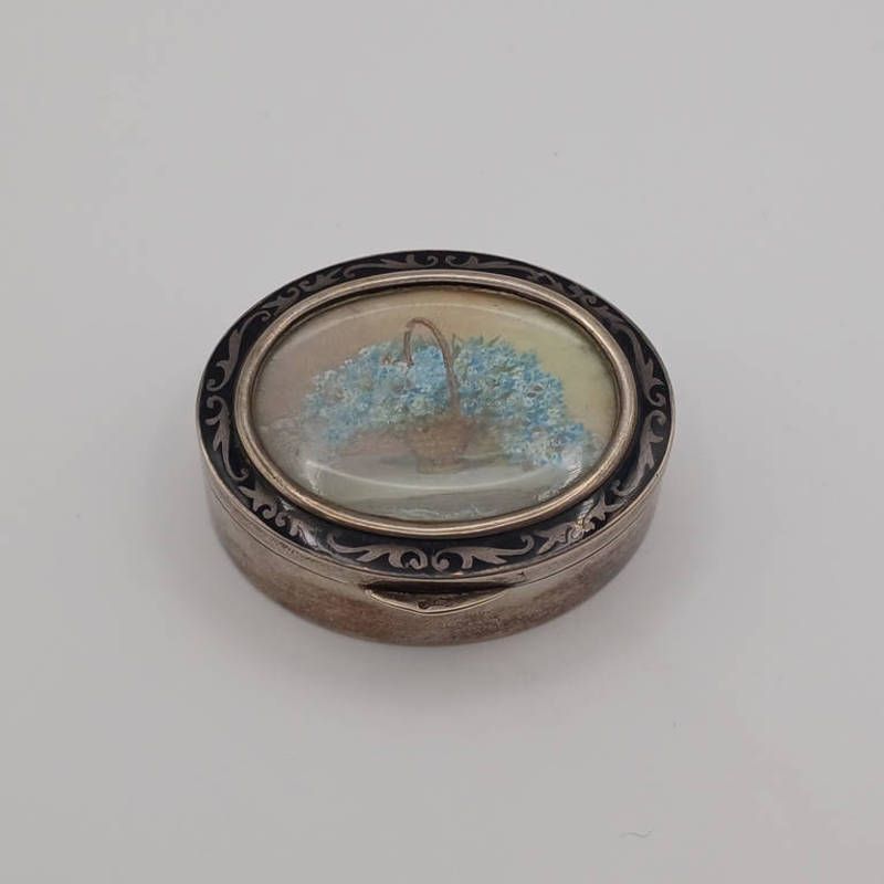 French silver oval box with a painted oval panel lid set within a niello work border - 5.5 cm wide