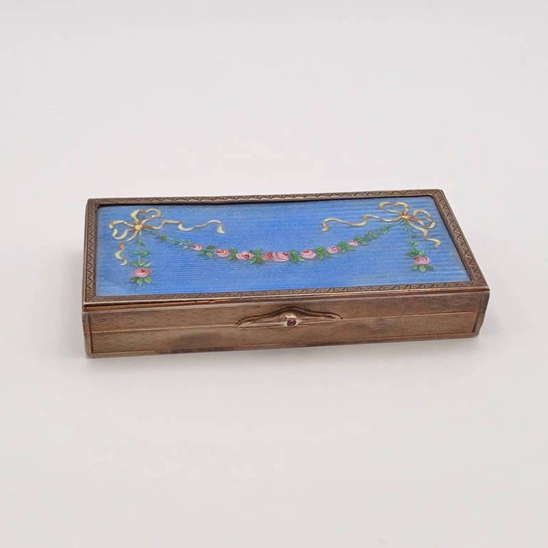 Silver & enamel oblong box, the lid decorated with pink roses on a blue background, with import marks for louis desoutter, london 1907 - 8cm long