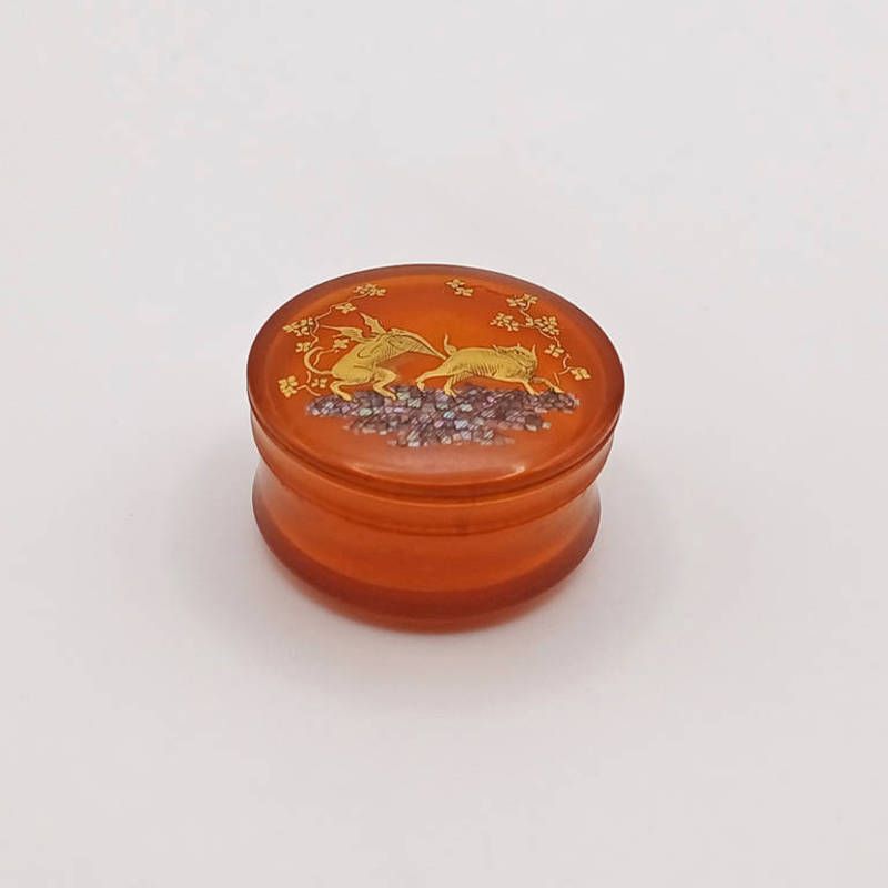 Georgian blonde tortoiseshell patch box with gold pique work inlay depicting 2 mythical creatures - 3cm diameter