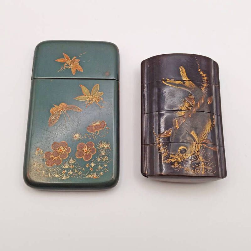 19th century japanese lacquer 4-section inro decorated with a koi fish & a japanese green lacquer card case decorated with flowers & butterflies - inro 8cm long