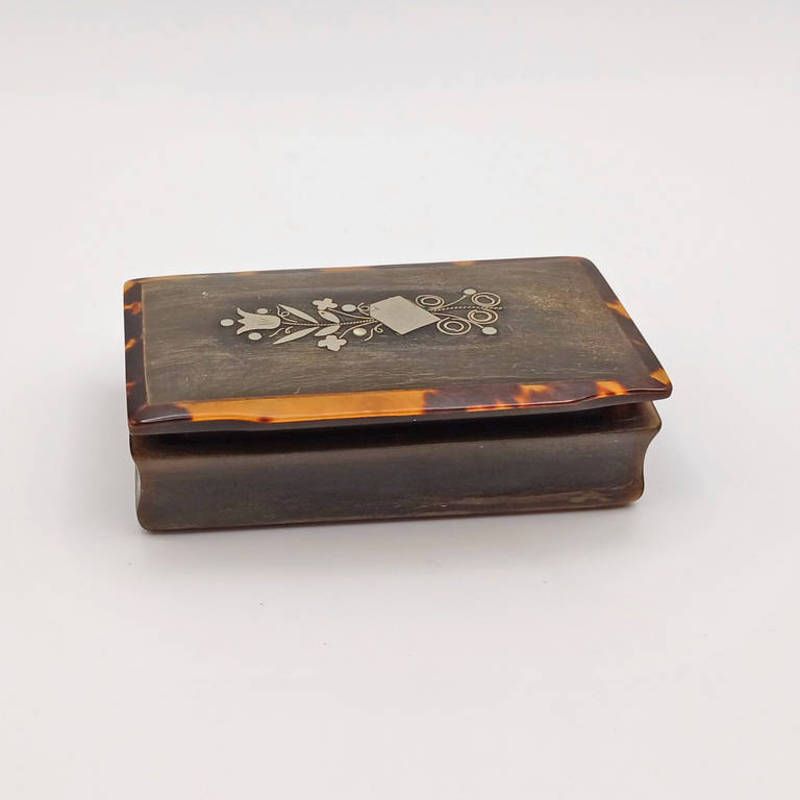 19th century scottish horn snuff box with tortoiseshell border & silver inlay to top - 7.6cm wide