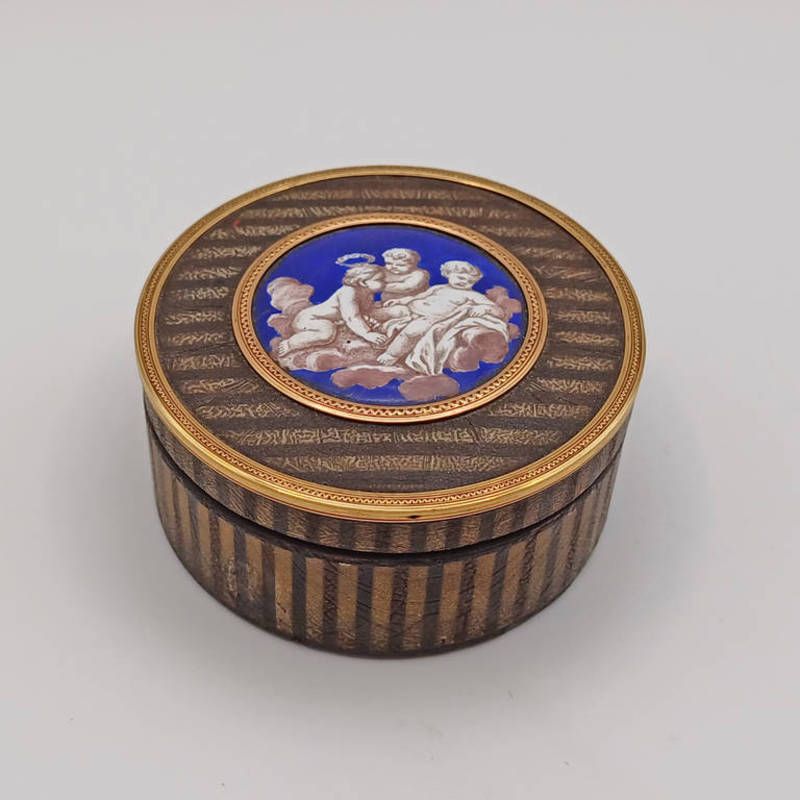 Early 19th century circular red tortoiseshell box with gold mounts & porcelain panel depicting cherubs inset to lid - 6cm diameter