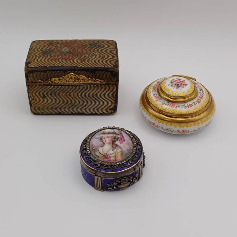 Floral decorated porcelain & gilt metal 2-tier circular box, white metal & blue enamel circular box with portrait panel to lid & 1 other