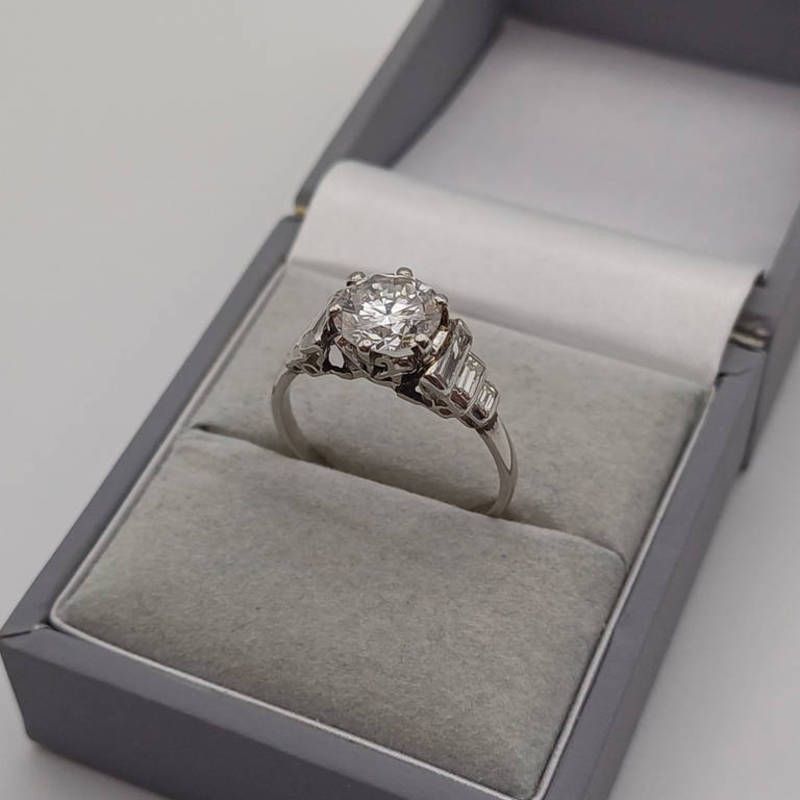 An art deco diamond solitaire ring, the brilliant cut diamond of approx 1.63 carats set between graduated baguette diamond shoulders on a platinum mount - ring size: p/q