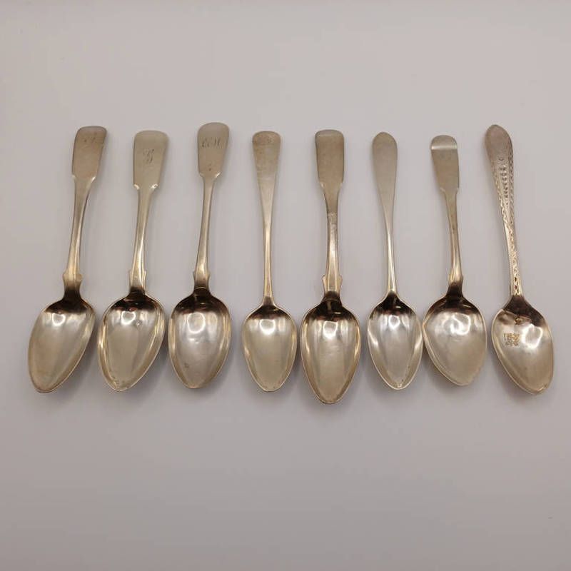 8 georgian scottish silver teaspoons from various makers & dates including a pair by jmd, edinburgh 1818. 123 g