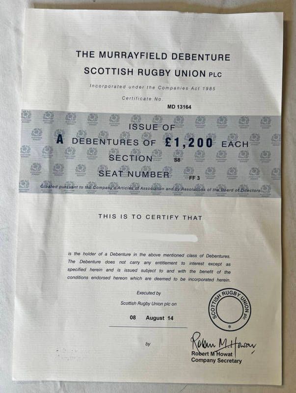 Scottish rugby union (sru) irredeemable debenture no. 875/1250. this debenture will entitle the holder to...