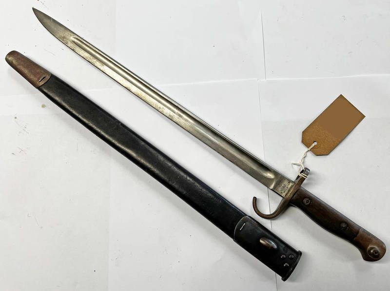 Rare hooked quillion 1907 pattern bayonet by mole with regimental markings to pommel, the 43cm long blade marked 1907 with crowned er cypher to ricasso dated 8,10, along with various inspection marks and stamped mole, hooked quillion with characteristic grip and pommel marked '2gr 876' with its steel mounted leather scabbard with various markings to include inspection marks and 'ac'