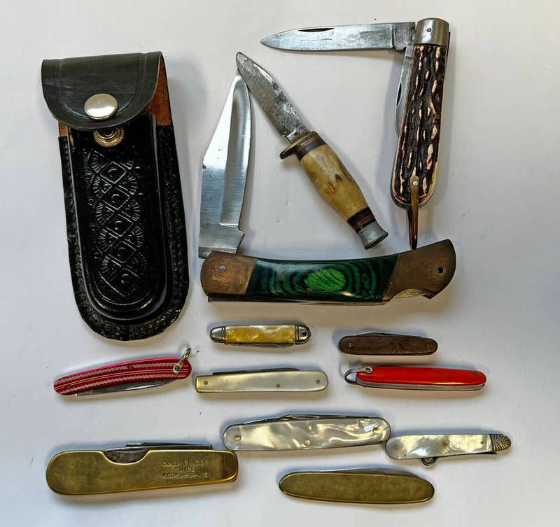 Selection of pocket knives to include a ''gold finger'' knife, mother of pearl examples, ck pocket knife, etc