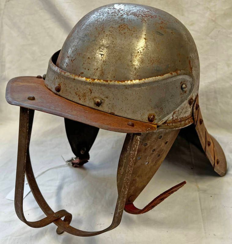 Reproduction english civil war style losbter pot helmet, steel construction with brass rivets & characteristic...