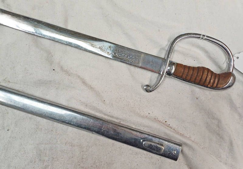 Indian / middle eastern dress / parade short sword with 67cm long plated blade with script, characteristic hilt and ribbed wooden grip with its plated metal scabbard