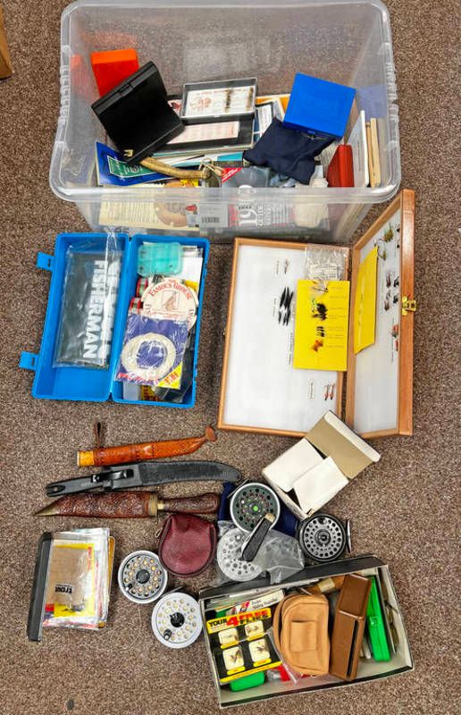 Fishing tackle - 2 shakespeare beaulite 3 1/4 fly reels, fly boxes with various contents, fly fishing related books, etc in 1 box