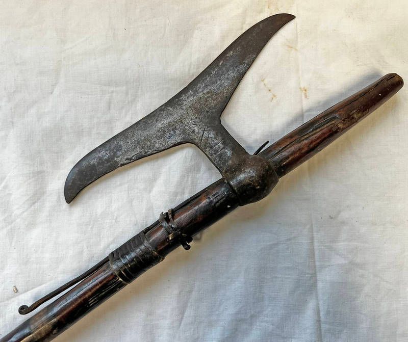 Indian bullova fighting axe with 22.5cm long edged blade with decorated mount, on a wooden pole with binding, 64cm
