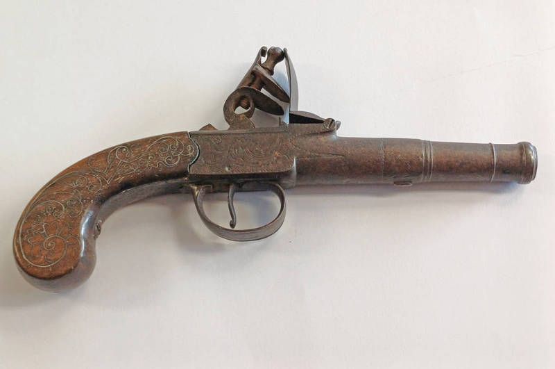 54 bore flintlock pocket pistol with 6cm long turn-off cannon barrel, box lock action engraved with scrolls, trophies & initialled wws to one side, proof marks & a slab sided white metal inlaid wooden grip