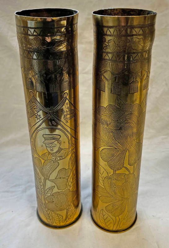 7 trench art artillery shells with scenes to include pair of pow 369 royal artillery,...