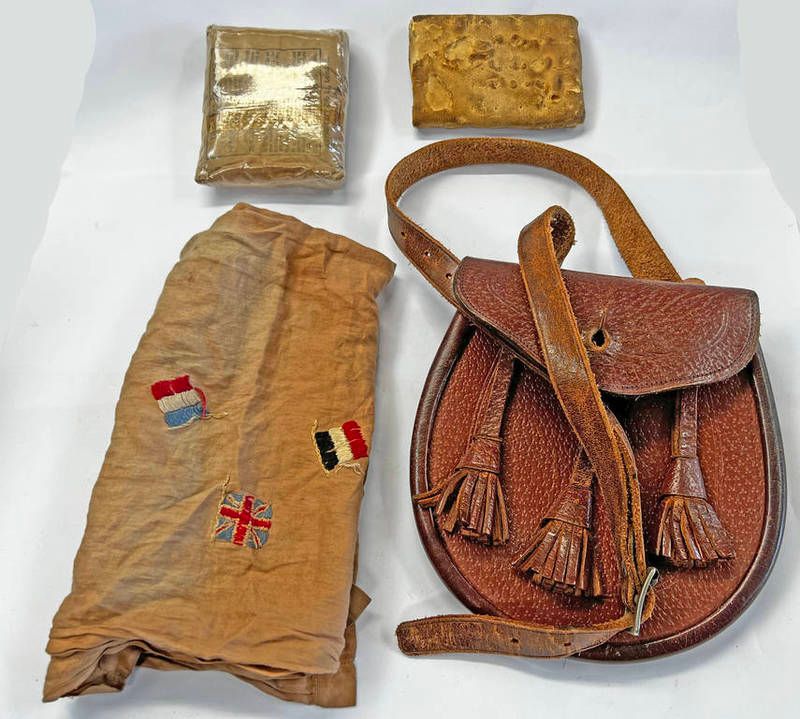 Ww1 era fabric panel with flags, hard tack cracker presumably from the same time period, field dressing and a leather sporran -4-