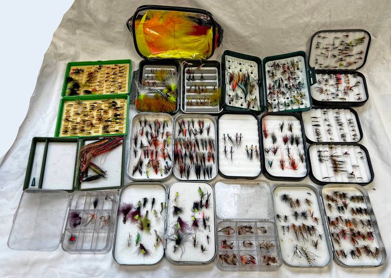 12 various fly boxes to include makers such as wheatley, snowbee, fox, etc