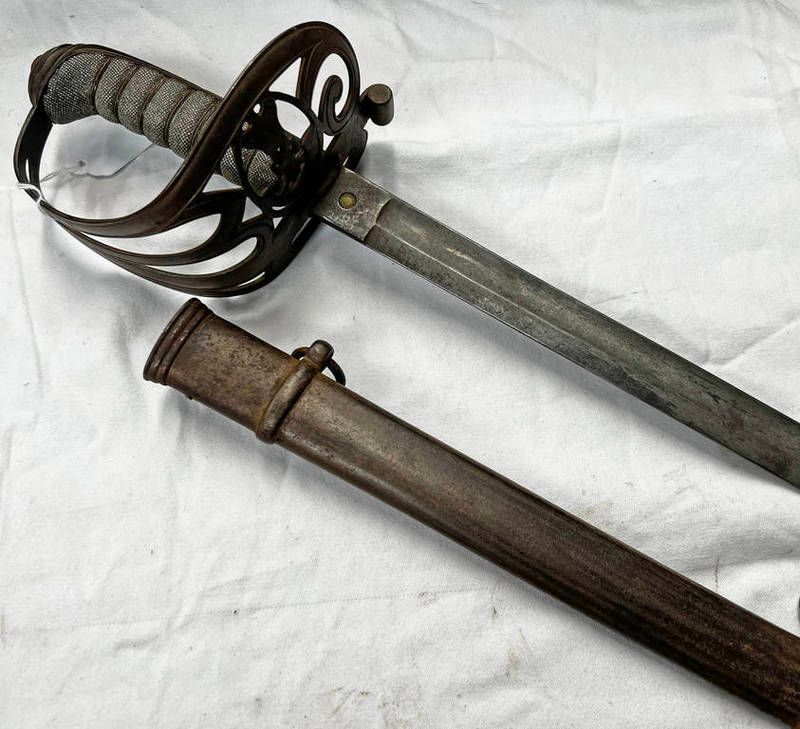 19th century infantry sword with 83cm long straight blade etched stewart george street, edinburgh, hilt...