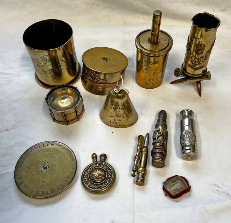 Selection of ww1 & other brass trench art to include lighters, ashtrays, falkland islands bell, rb hospital bighi 1916 bell, etc