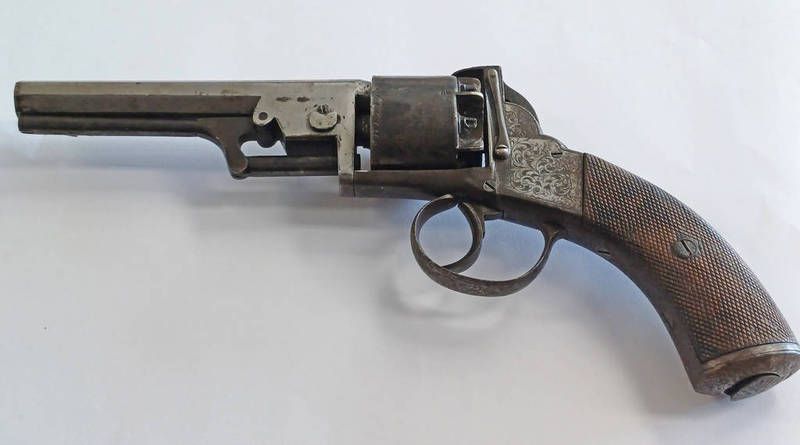 54 bore six shot self cocking percussion revolver of bentley type by joseph bourne, maker, london, the 14cm long barrel signed to top flat, body with engraving, chequered grips, with butt trap cover