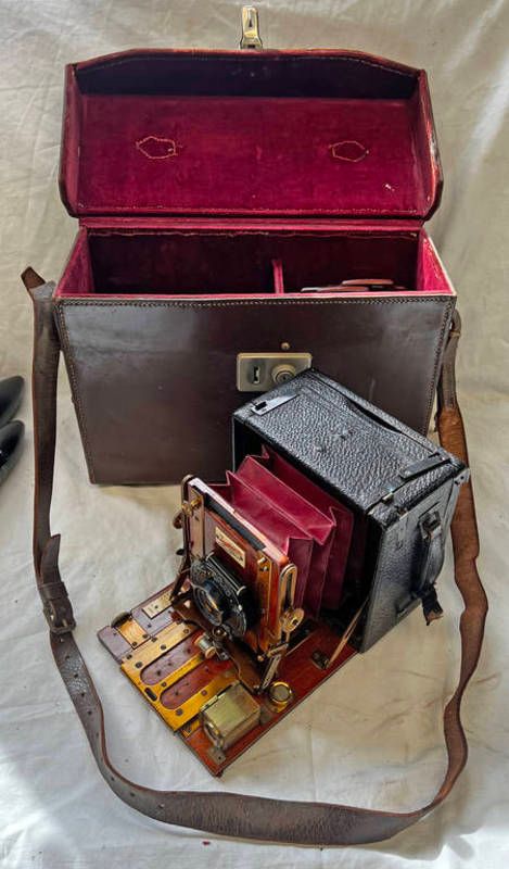 The sanderson camera by g h & s london, with bausch & lomb 4 x 5 lens with its fitted case with accessories