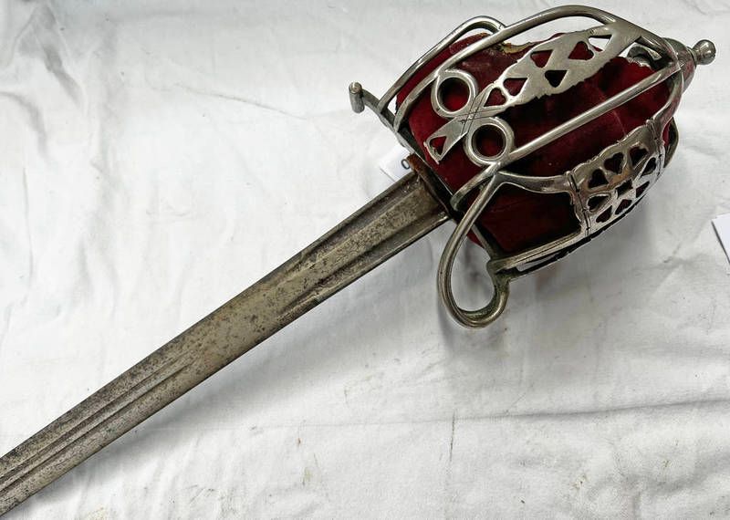 Scottish officers regimental basket hilted broadsword with tapering double fullered double edged 82cm long blade, regulation steel guard with leather liner & shagreen wire bound grip