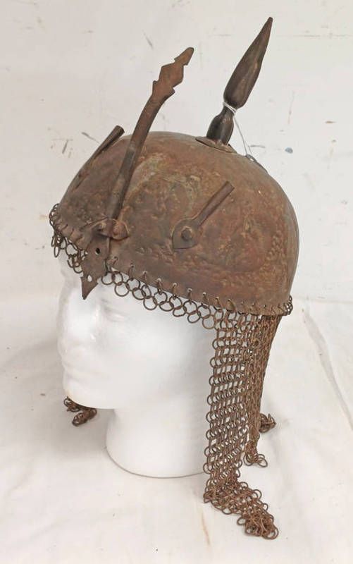Khula khud helmet of characteristic steel form with hammered decoration to include several busts, central spike to top & a nose guard with screw along with a chain mail guard