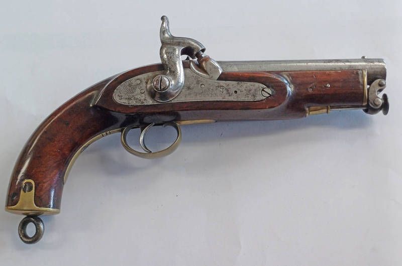 British percussion coast guard pistol, 24 bore, 5.5 inch sighted barrel, lock signed 1855 tower with a crowned vr, full stock, stirrup ramrod, belt hanger & pommel hoop
